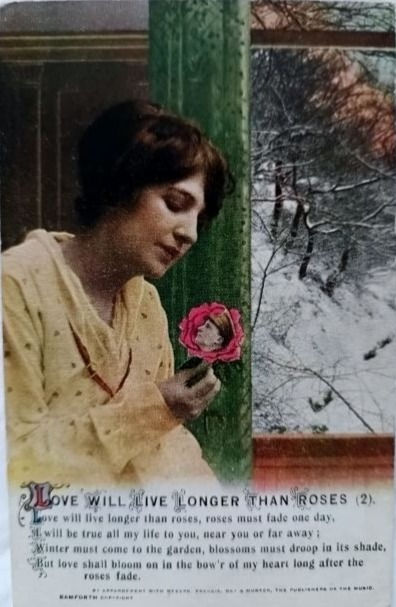 Woven silk postcards originated in Krefeld, Germany, in 1898, blending printed postcards with large woven silk images known as Stevengraphs. These early cards were crafted on machines, ensuring a consistently high quality. Embroidered silk made its debut in 1900 for the Paris Exposition, with its popularity surging during World War I from 1914 to 1918. A flourishing cottage industry emerged around 1915, with high-quality silk, although later cards often compromised on craftsmanship to meet rising demand. Postcard companies began hiring women to work on a rough assembly line, with many cards hand-embroidered on strips of silk mesh, sometimes featuring up to 25 on a single strip. Most of this was done by French women before the cards were sent to factories for cutting and mounting. Some postcards included small envelopes with a sentimental message. Production remained steady through World War I, but declined in 1919, ultimately ceasing around 1923, with an estimated 10,000,000 handmade cards created between 1915 and 1919.